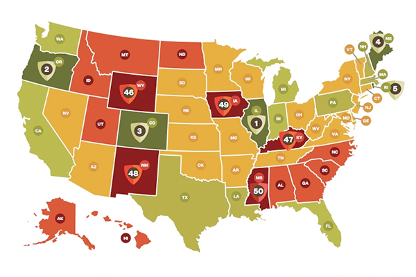 US map showing the states color coded according to the strength of their animal protection laws in 2020.